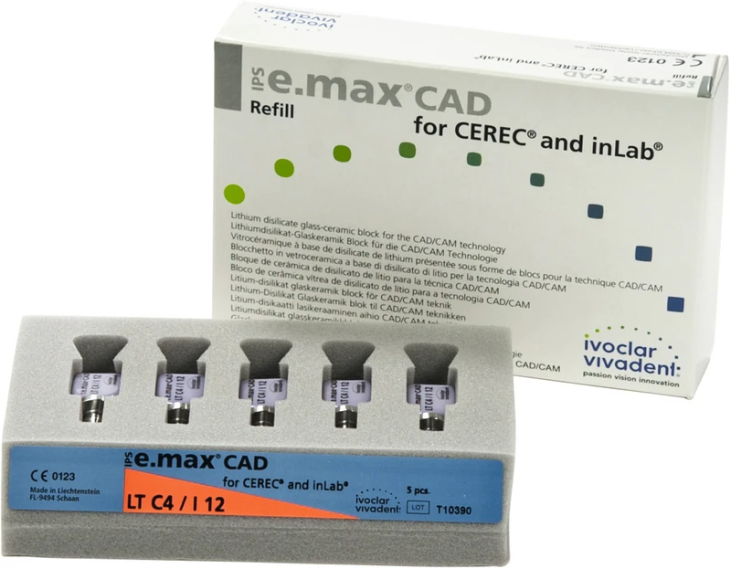 Die IPS e.max CAD for CEREC/inLab ist eine hochfeste Lithiumdisilikat-Vollkeramik, mit idealen ästhetischen Eigenschaften. Die Keramikblocks sind optimal für die Herstellung von vollanatomischen Kronen, Inlays und Veneers geeignet und werden im inLab-System oder CEREC-System (Sirona) verarbeitet. Die Blocks sind in unkristallisiertem Zustand bläulich und leicht bearbeitbar. Nach dem Kristallisationsbrand ist die Keramik zahnfarben und hochfest. IPS e.max Kronen aus CAD LT können selbstadhäsiv oder konventionell befestigt werden.