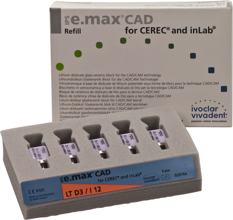 Die IPS e.max CAD for CEREC/inLab ist eine hochfeste Lithiumdisilikat-Vollkeramik, mit idealen ästhetischen Eigenschaften. Die Keramikblocks sind optimal für die Herstellung von vollanatomischen Kronen, Inlays und Veneers geeignet und werden im inLab-System oder CEREC-System (Sirona) verarbeitet. Die Blocks sind in unkristallisiertem Zustand bläulich und leicht bearbeitbar. Nach dem Kristallisationsbrand ist die Keramik zahnfarben und hochfest. IPS e.max Kronen aus CAD LT können selbstadhäsiv oder konventionell befestigt werden.