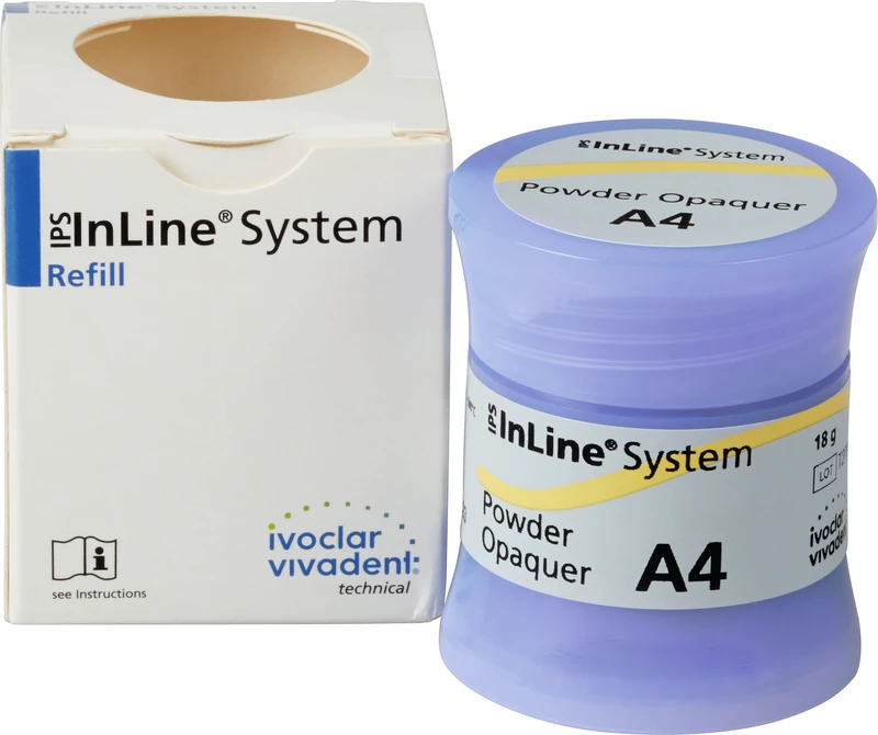 Der IPS InLine® System Pulveropaquer ist ein in einem neuen Herstellungsverfahren entwickelter Pulveropaquer mit optimierten Eigenschaften für die metallkeramische Schicht und Presstechnik. Der IPS InLine® System Pulveropaquer ist abgestimmt auf aufbrennfähige Legierungsgerüste hergestellt mittels der Guss, CAD/CAM und Laser Schmelz Technik.