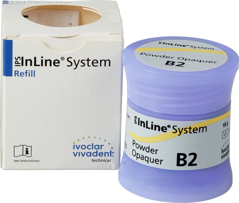 Der IPS InLine® System Pulveropaquer ist ein in einem neuen Herstellungsverfahren entwickelter Pulveropaquer mit optimierten Eigenschaften für die metallkeramische Schicht und Presstechnik. Der IPS InLine® System Pulveropaquer ist abgestimmt auf aufbrennfähige Legierungsgerüste hergestellt mittels der Guss, CAD/CAM und Laser Schmelz Technik.
