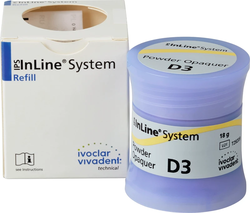 Der IPS InLine® System Pulveropaquer ist ein in einem neuen Herstellungsverfahren entwickelter Pulveropaquer mit optimierten Eigenschaften für die metallkeramische Schicht und Presstechnik. Der IPS InLine® System Pulveropaquer ist abgestimmt auf aufbrennfähige Legierungsgerüste hergestellt mittels der Guss, CAD/CAM und Laser Schmelz Technik.