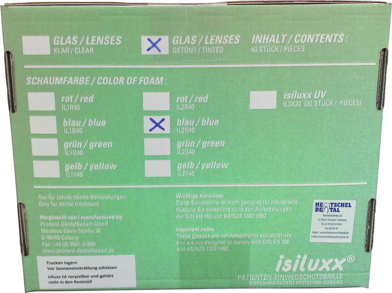 isiluxx UV Patienten-Einwegschutzbrille in 4 Farben, Folie klar oder getönt. Ideal für die PZR, Bleaching und UV-Arbeiten. Schütz die Augen Ihrer Patienten sicher vor Bohr- und Frässpane sowie vor Spray, etc. Hoher Infektionsschutz. Empfohlen auch für den Behandler.
