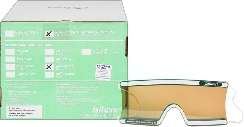 isiluxx UV Patienten-Einwegschutzbrille in 4 Farben, Folie klar oder getönt. Ideal für die PZR, Bleaching und UV-Arbeiten. Schütz die Augen Ihrer Patienten sicher vor Bohr- und Frässpane sowie vor Spray, etc. Hoher Infektionsschutz. Empfohlen auch für den Behandler.