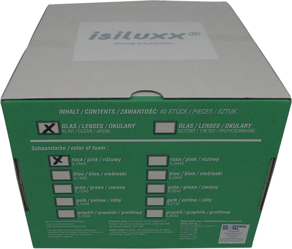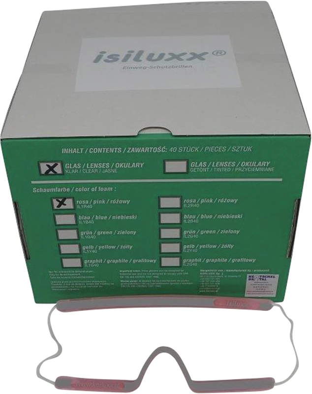 isiluxx UV Patienten-Einwegschutzbrille in 4 Farben, Folie klar oder getönt. Ideal für die PZR, Bleaching und UV-Arbeiten. Schütz die Augen Ihrer Patienten sicher vor Bohr- und Frässpane sowie vor Spray, etc. Hoher Infektionsschutz. Empfohlen auch für den Behandler.