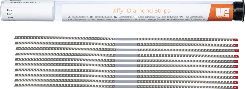 Jiffy Streifen und Sägen sind aus Edelstahl gefertigt, um Bruch zu widerstehen, bieten ein perforiertes Design zur Unterstützung der Schmutzentfernung und sind dünn und flexibel, um ein optimales Finish zu erzielen. Sie sind autoklavierbar und haben eine diamantfreie Zone für ein einfaches Einführen zwischen den Zähnen.