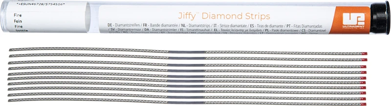 Jiffy Streifen und Sägen sind aus Edelstahl gefertigt, um Bruch zu widerstehen, bieten ein perforiertes Design zur Unterstützung der Schmutzentfernung und sind dünn und flexibel, um ein optimales Finish zu erzielen. Sie sind autoklavierbar und haben eine diamantfreie Zone für ein einfaches Einführen zwischen den Zähnen.
