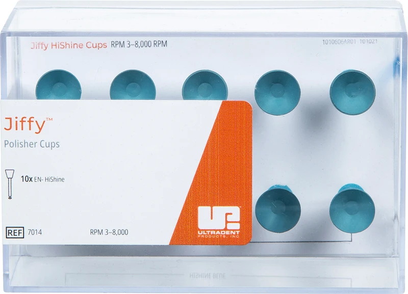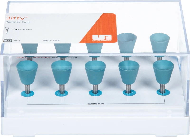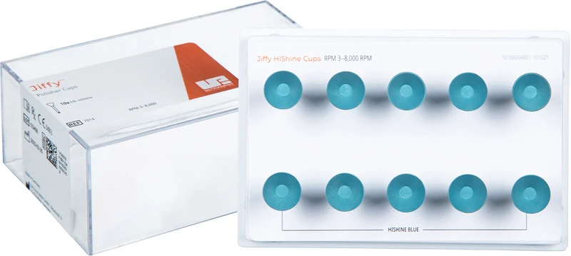 Das Jiffy Original Verbundsystem besteht aus hochwertigen Polierbechern, Spitzen, Scheiben und Bürsten. Die Polierer verfügen über unsere speziell formulierte Körnung, die jedem Verbundmaterial ein schönes Finish verleiht, und sind in groben, mittleren und feinen Körnungen für eine schnelle und vollständige Formgebung jeder Verbundrestauration erhältlich. Die Polierbecher verfügen über ein ausgestelltes, flexibles, dünnwandiges Design, das sich ideal zum Polieren in der Nähe der Gingiva eignet. Jiffy HiShine Polierer mit ultrafeiner Körnung sind ebenfalls erhältlich, um ein extra glattes und hochglanzpoliertes Finish zu erzielen.