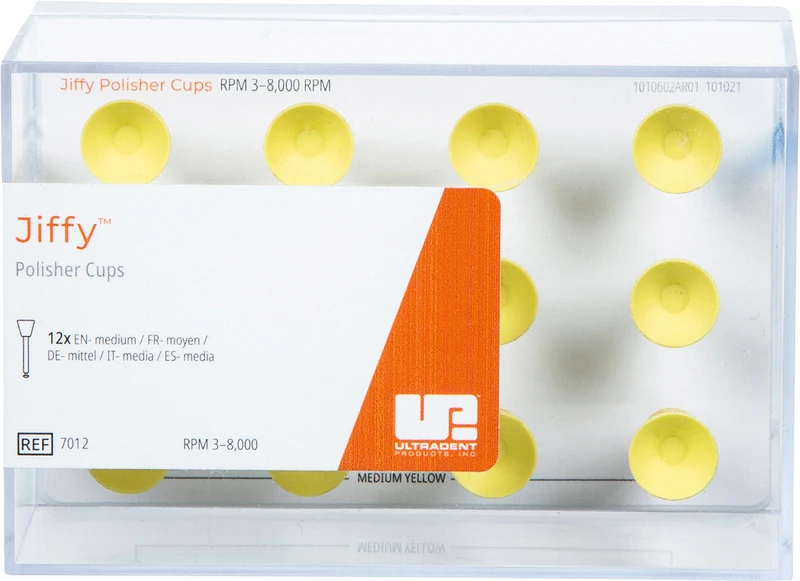 Das Jiffy Original Verbundsystem besteht aus hochwertigen Polierbechern, Spitzen, Scheiben und Bürsten. Die Polierer verfügen über unsere speziell formulierte Körnung, die jedem Verbundmaterial ein schönes Finish verleiht, und sind in groben, mittleren und feinen Körnungen für eine schnelle und vollständige Formgebung jeder Verbundrestauration erhältlich. Die Polierbecher verfügen über ein ausgestelltes, flexibles, dünnwandiges Design, das sich ideal zum Polieren in der Nähe der Gingiva eignet. Jiffy HiShine Polierer mit ultrafeiner Körnung sind ebenfalls erhältlich, um ein extra glattes und hochglanzpoliertes Finish zu erzielen.