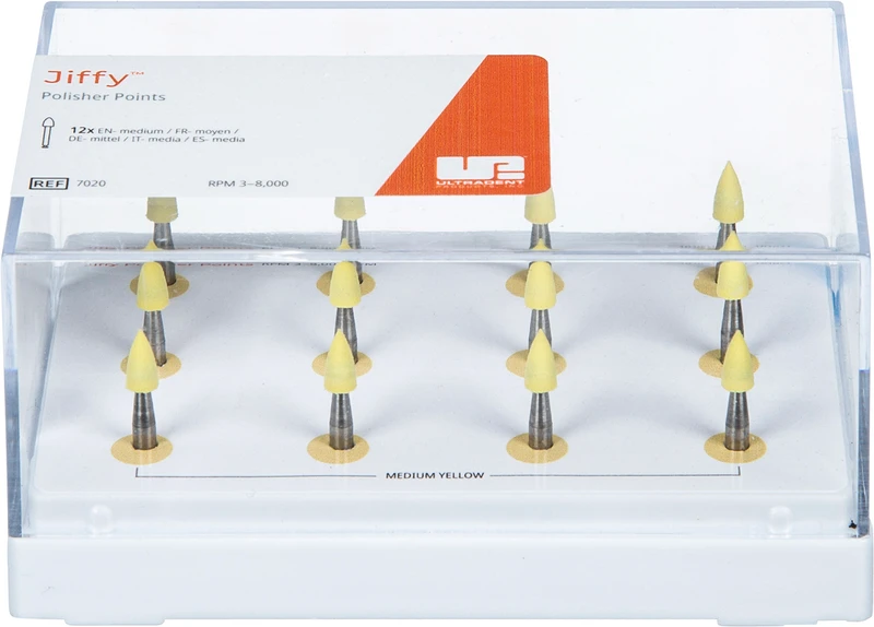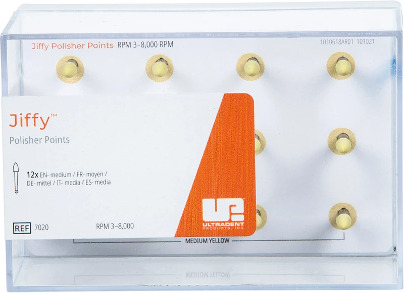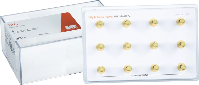 Das Jiffy Original Verbundsystem besteht aus hochwertigen Polierbechern, Spitzen, Scheiben und Bürsten. Die Polierer verfügen über unsere speziell formulierte Körnung, die jedem Verbundmaterial ein schönes Finish verleiht, und sind in groben, mittleren und feinen Körnungen für eine schnelle und vollständige Formgebung jeder Verbundrestauration erhältlich. Die Polierbecher verfügen über ein ausgestelltes, flexibles, dünnwandiges Design, das sich ideal zum Polieren in der Nähe der Gingiva eignet. Jiffy HiShine Polierer mit ultrafeiner Körnung sind ebenfalls erhältlich, um ein extra glattes und hochglanzpoliertes Finish zu erzielen.