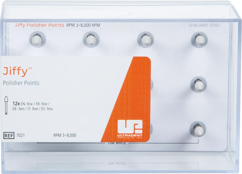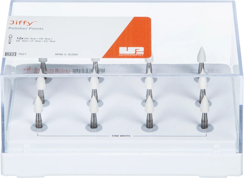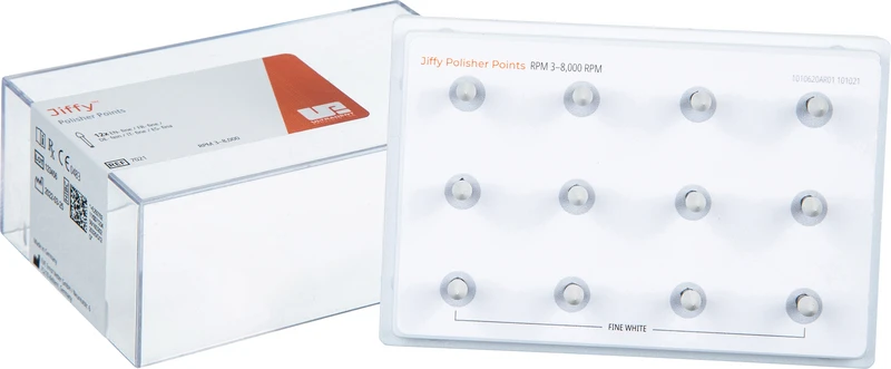 Das Jiffy Original Verbundsystem besteht aus hochwertigen Polierbechern, Spitzen, Scheiben und Bürsten. Die Polierer verfügen über unsere speziell formulierte Körnung, die jedem Verbundmaterial ein schönes Finish verleiht, und sind in groben, mittleren und feinen Körnungen für eine schnelle und vollständige Formgebung jeder Verbundrestauration erhältlich. Die Polierbecher verfügen über ein ausgestelltes, flexibles, dünnwandiges Design, das sich ideal zum Polieren in der Nähe der Gingiva eignet. Jiffy HiShine Polierer mit ultrafeiner Körnung sind ebenfalls erhältlich, um ein extra glattes und hochglanzpoliertes Finish zu erzielen.