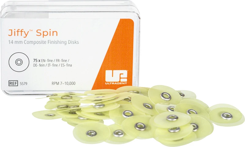 - Die ultradünnen Jiffy Spin-Scheiben können auf allen Zahnoberflächen genutzt werden und passen optimal in enge Approximalbereiche.Jiffy Spin ist in 2 verschiedenen Durchmessern erhältlich: 10 mm und 14 mm. Die kleineren Scheiben sind bei Behandlung kleinerer Zähne, wie den unteren Schneide-zähnen, nützlich
