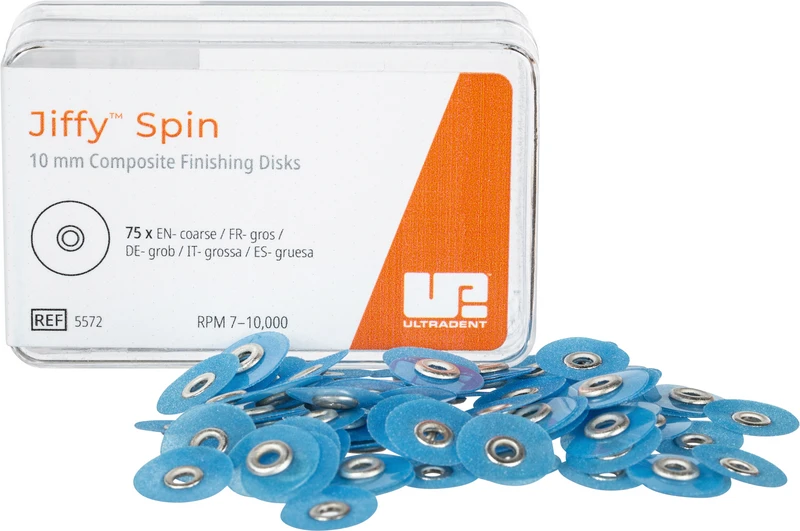 - Die ultradünnen Jiffy Spin-Scheiben können auf allen Zahnoberflächen genutzt werden und passen optimal in enge Approximalbereiche.Jiffy Spin ist in 2 verschiedenen Durchmessern erhältlich: 10 mm und 14 mm. Die kleineren Scheiben sind bei Behandlung kleinerer Zähne, wie den unteren Schneide-zähnen, nützlich