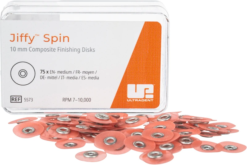 - Die ultradünnen Jiffy Spin-Scheiben können auf allen Zahnoberflächen genutzt werden und passen optimal in enge Approximalbereiche.Jiffy Spin ist in 2 verschiedenen Durchmessern erhältlich: 10 mm und 14 mm. Die kleineren Scheiben sind bei Behandlung kleinerer Zähne, wie den unteren Schneide-zähnen, nützlich