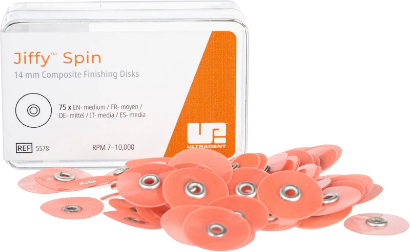 - Die ultradünnen Jiffy Spin-Scheiben können auf allen Zahnoberflächen genutzt werden und passen optimal in enge Approximalbereiche.Jiffy Spin ist in 2 verschiedenen Durchmessern erhältlich: 10 mm und 14 mm. Die kleineren Scheiben sind bei Behandlung kleinerer Zähne, wie den unteren Schneide-zähnen, nützlich