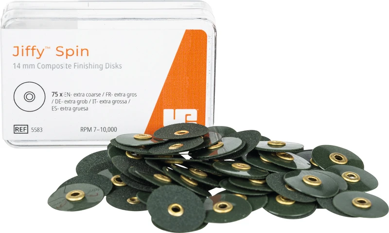 - Die ultradünnen Jiffy Spin-Scheiben können auf allen Zahnoberflächen genutzt werden und passen optimal in enge Approximalbereiche.Jiffy Spin ist in 2 verschiedenen Durchmessern erhältlich: 10 mm und 14 mm. Die kleineren Scheiben sind bei Behandlung kleinerer Zähne, wie den unteren Schneide-zähnen, nützlich