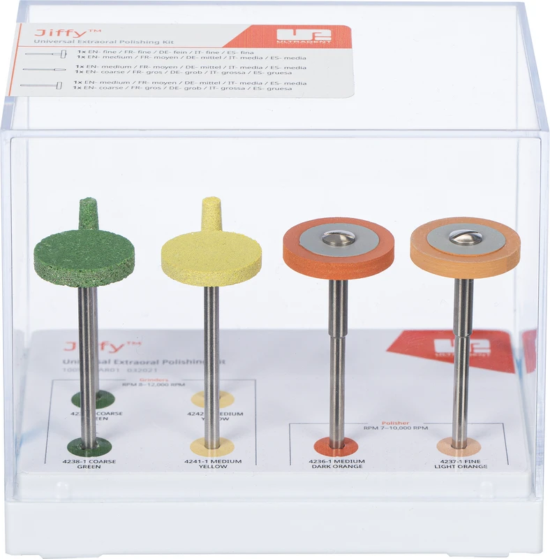 Jiffy Universal Extraoral Adjusting & Polishing Kit 6 Stück (2 x grob, 3 x mittel, 1x fein), HP, 1 Alu Block