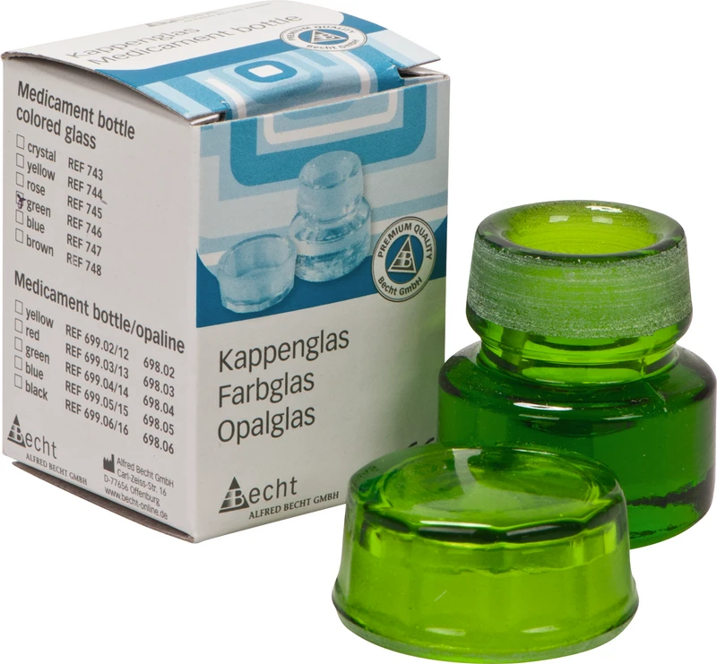 Für die Aufbewahrung von Arzeimitteln. Unterschiedliche Farbmarkierungen schützen vor der Verwechslung des Inhaltes. Der griffsichere Deckel schließt das Kappenglas luftdicht ab. Die ausgewölbte Innenform ermöglicht die vollständige Entnahme des Medikamentes. 32 mm Bodendurchmesser, 42 mm hoch, 3 ml Fassungsvermögen.