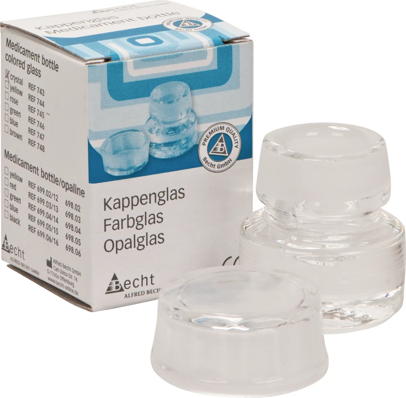 Für die Aufbewahrung von Arzeimitteln. Unterschiedliche Farbmarkierungen schützen vor der Verwechslung des Inhaltes. Der griffsichere Deckel schließt das Kappenglas luftdicht ab. Die ausgewölbte Innenform ermöglicht die vollständige Entnahme des Medikamentes. 32 mm Bodendurchmesser, 42 mm hoch, 3 ml Fassungsvermögen.
