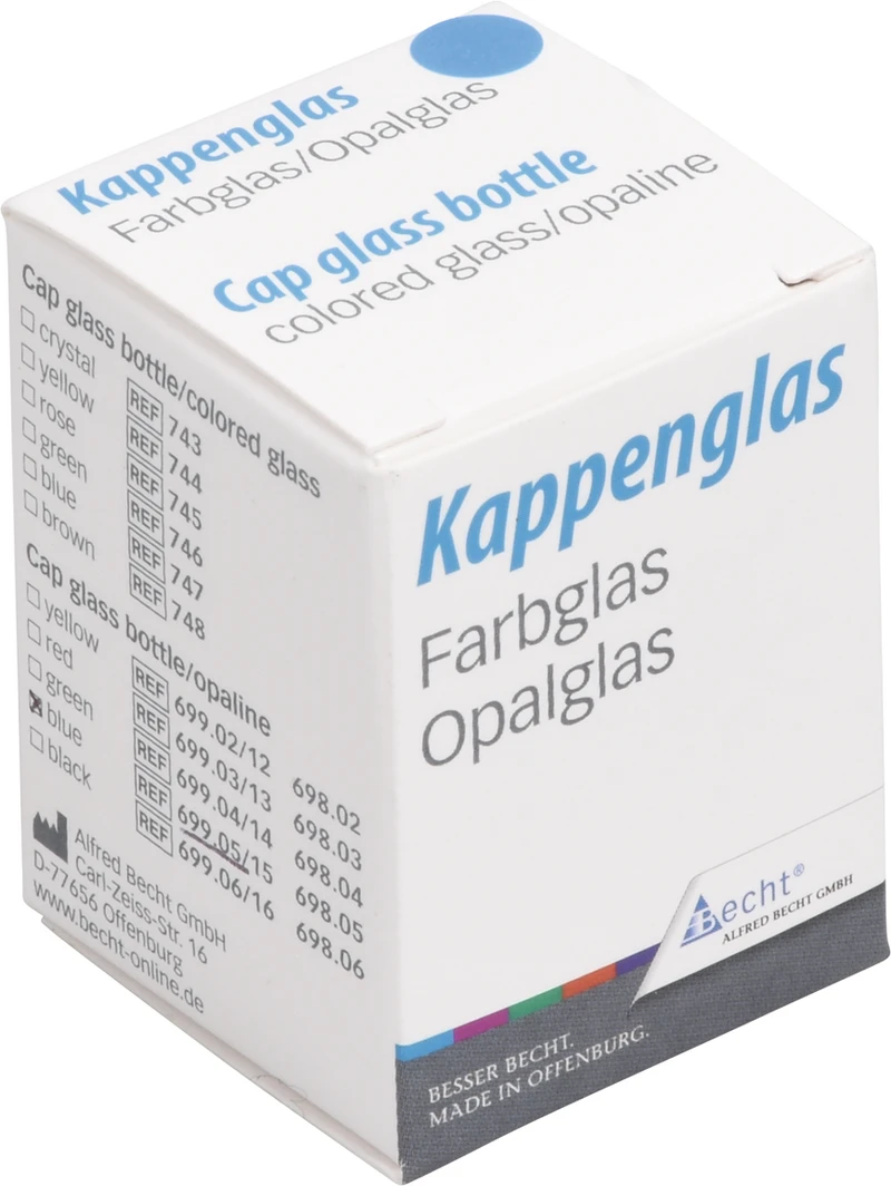 Für die Aufbewahrung von Arzeimitteln. Mit farbiger Beringung an der Schulter des Unterteiles und am unteren Rand des Deckels. Unterschiedliche Farbmarkierungen schützen vor der Verwechslung des Inhalts. Der griffsichere Deckel schließt das Kappenglas luftdicht ab. Die ausgewölbte Innenform ermöglicht die vollständige Entnahme des Medikamentes. 32 mm Bodendurchmesser, 42 mm hoch, ca. 3 ml Fassungsvermögen. Autoklavierbar.