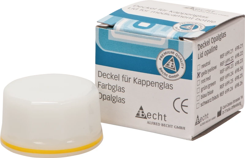 Für die Aufbewahrung von Arzeimitteln. Autoklavierbar. Mit farbiger Beringung am oberen Rand des Unterteils und am unteren Rand des Deckels für die Aufbewahrung in Schubfächern. Unterschiedliche Farbmarkierungen schützen vor der Verwechslung des Inhalts. Der griffsichere Deckel schließt das Kappenglas luftdicht ab. Die ausgewölbte Innenform ermöglicht die vollständige Entnahme des Medikamentes. 32 mm Bodendurchmesser, 42 mm hoch, ca. 3 ml Fassungsvermögen.