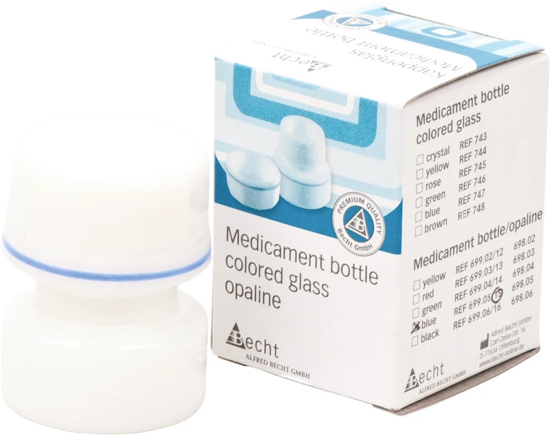 Für die Aufbewahrung von Arzeimitteln. Autoklavierbar. Mit farbiger Beringung am oberen Rand des Unterteils und am unteren Rand des Deckels für die Aufbewahrung in Schubfächern. Unterschiedliche Farbmarkierungen schützen vor der Verwechslung des Inhalts. Der griffsichere Deckel schließt das Kappenglas luftdicht ab. Die ausgewölbte Innenform ermöglicht die vollständige Entnahme des Medikamentes. 32 mm Bodendurchmesser, 42 mm hoch, ca. 3 ml Fassungsvermögen.