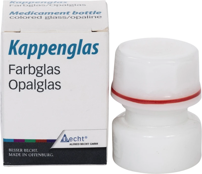 Für die Aufbewahrung von Arzeimitteln. Autoklavierbar. Mit farbiger Beringung am oberen Rand des Unterteils und am unteren Rand des Deckels für die Aufbewahrung in Schubfächern. Unterschiedliche Farbmarkierungen schützen vor der Verwechslung des Inhalts. Der griffsichere Deckel schließt das Kappenglas luftdicht ab. Die ausgewölbte Innenform ermöglicht die vollständige Entnahme des Medikamentes. 32 mm Bodendurchmesser, 42 mm hoch, ca. 3 ml Fassungsvermögen.
