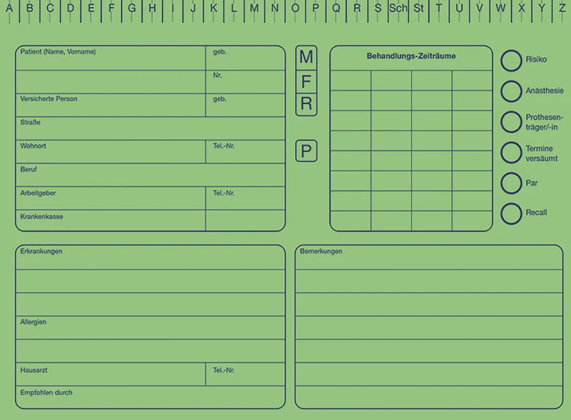 Die Karteikarten bestehen aus festem Kartonmaterial mit schmutzabweisender, glatter Oberfläche. Info-Felder auf der Außenseite und im Inneren der Karteikarte sorgen für schnelles Auffinden patientenrelevanter Daten.