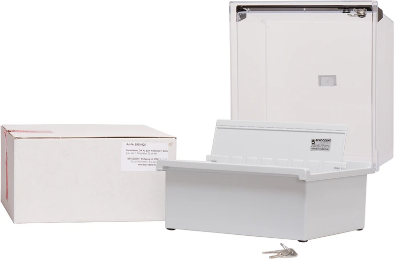 Trotz seiner kompakten Maße bietet der Karteikasten Platz für bis zu 800 Karteikarten im Querformat. Eine Stützplatte mit Sichtreiter ist bereits enthalten und erleichtert die übersichtliche Sortierung z.B. nach Fachrichtungen, Behandlungsarten oder zeitlichen Abläufen.