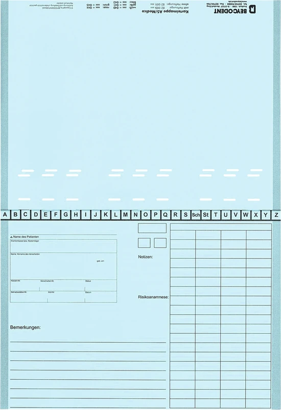 Patientenkartei / Behandlungskartei mit eingezogener Heftzunge. Original BEYCODENT Karteimappe.