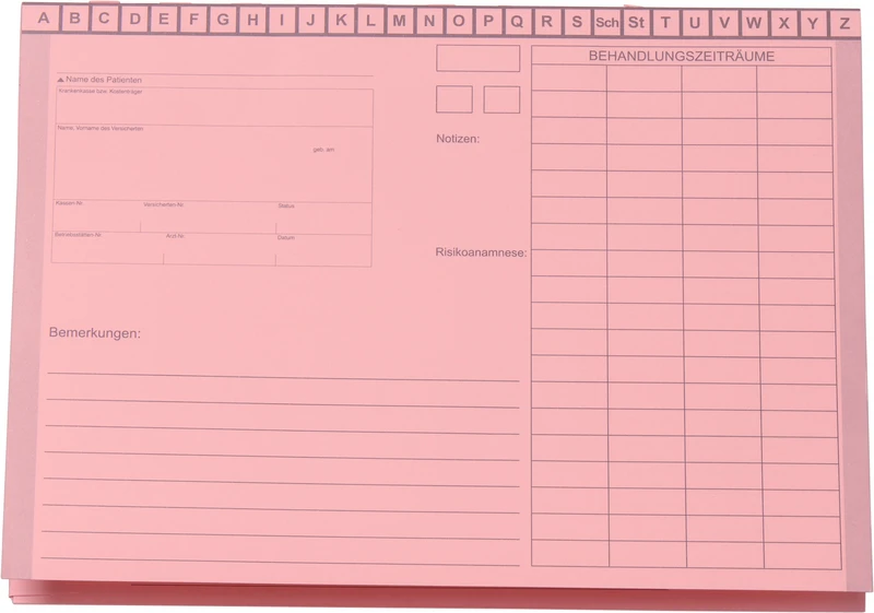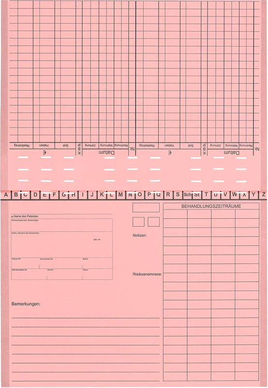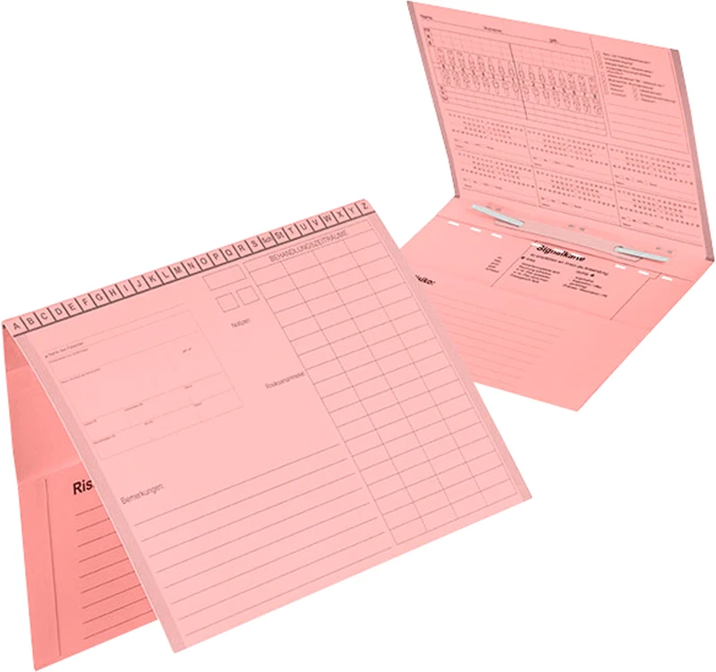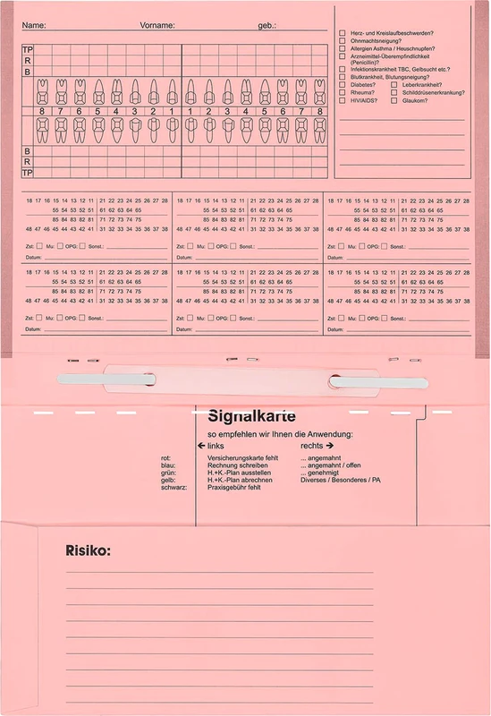 - Innenseite der Behandlungskartei hat übersichtlich Platz 9 für 01-Befunde, Risikoanamnese usw.