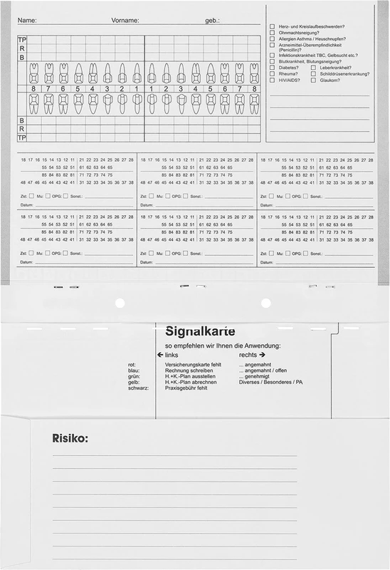 - Innenseite der Behandlungskartei hat übersichtlich Platz 9 für 01-Befunde, Risikoanamnese usw.