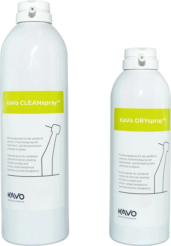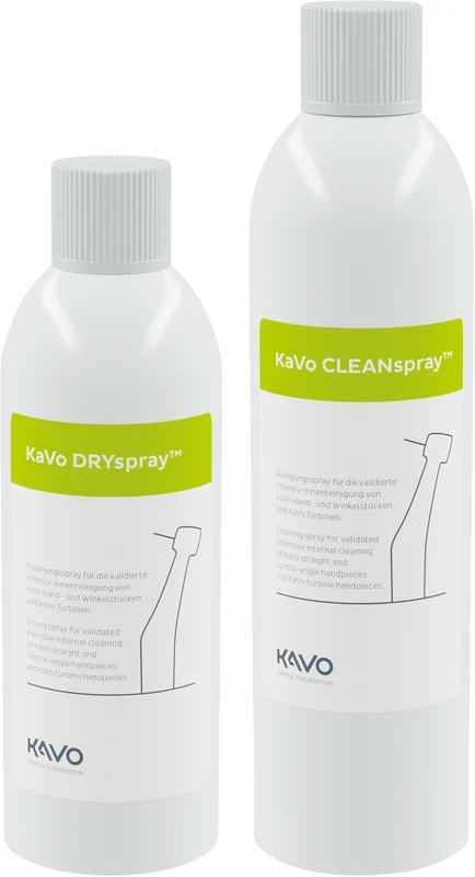 KaVo CLEANspray ist eine gebrauchsfertige, alkoholfreie Lösung und wird zur manuellen Wiederaufbereitung als nicht proteinfixierenden Reinigung von dentalen Hohlkörperinstrumenten angewendet. Nach der Reinigung und/oder Desinfektion wird der gebrauchsfertige KaVo DRYspray zur Trocknung der Innenflächen dentaler Hohlkörperinstrumente verwendet.