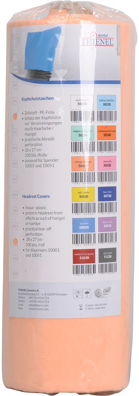 Zellstoff - PE-Folie. Schutz der Kopfstütze vor Verunreinigungen. Farblich passend zu unseren Patientenumhängen. Praktische Abreißperforation.