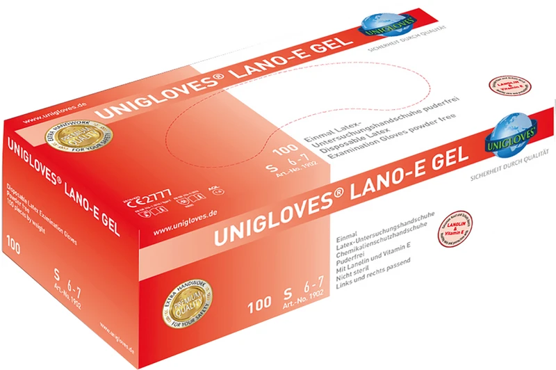 Unsterile, puderfreie LANO-E GEL Latexhandschuhe mit Rollrand.