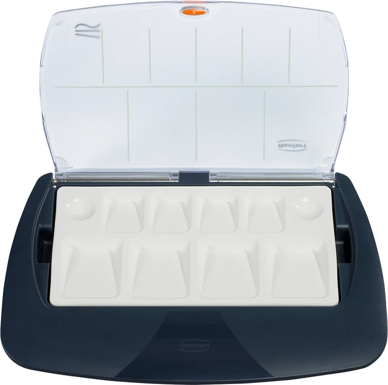 Die Weiterentwicklung des Kompetenzproduktes. Durchdachte Muldengeometrie: Individuelle Steuerung der optimalen Keramik-Konsistenz durch gezielte Platzierung der Massen auf der schrägen Ebene. Gleichmäßige Befeuchtung der Massen während des gesamten Arbeitsprozesses: kein Austrocknen, Überwässern und ständiges Nachfeuchten. pro XL - 12 große und 5 kleinen Mulden bieten viel Raum bei gleichzeitig perfektem Überblick für strukturiertes Arbeiten. pro S - klein aber fein bieten 4 großen und 4 kleinen Mulden die optimale Orientierung 2 glasierte Mulden bieten Platz für vielseitige Anwendungen (z. B. Modellierflüssigkeit).