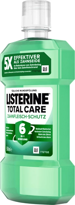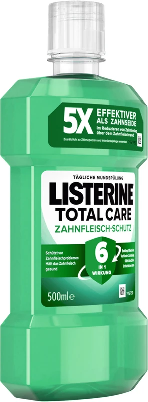 MUNDSPÜLUNG MIT RUNDUMSCHUTZ FÜR GESUNDES ZAHNFLEISCH. Eine umfassende Zahnpflege ist ein wichtiger Bestandteil bei der Vorbeugung von Zahnfleischproblemen. LISTERINE® TOTAL CARE ZAHNFLEISCH-SCHUTZ ist eine klinisch geprüfte Mundspülung, die Zahnbelag verhindert und reduziert. Zweimal am Tag angewendet verbessert LISTERINE® TOTAL CARE ZAHNFLEISCH-SCHUTZ die Mundhygiene mit ätherischen Ölen, Fluorid und Zinkformel und bietet Rundumschutz für gesundes Zahnfleisch mit 6 in 1 Wirkung. DIE VORTEILE VON LISTERINE® TOTAL CARE ZAHNFLEISCH-SCHUTZ: