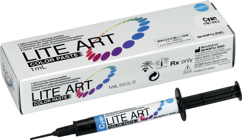 Mit LITE ART können Farben und Charakteristiken natürlicher Zähne einfach reproduziert werden. Alle 15 Farben sind fluoreszierend und können einzeln oder unterteinander gemischt angewendet werden. Sie beeindrucken durch ausgezeichnetes Applikationsverhalten, homogene Konstistenz und außerordentliche Deckkraft.