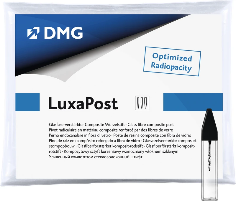 Glasfaserverstärkter, vorsilanisierter Composite-Wurzelstift mit dentinähnlichem Biegemodul; röntgenopak; substanzschonende konische Form; kein Vorbohren notwendig. Perfekt abgestimmt auf LuxaCore Z-Dual und LuxaBond-Total Etch.
