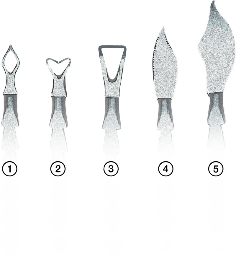 Mit der Präzisionswerkzeug-Linie MagiCut Back nach J. Braunwarth verfügen Sie stets über das ideale Werkzeug für ein filigranes Bearbeiten der Modelliermassen vor dem Sinterbrand. Die prägnanten Formen der 5 Instrumente, von denen sich auch ihre Namen ableiten, erleichtern das feine manuelle Herausarbeiten von Zahnschichten und -formen während des Keramikaufbaus durch Schaben, Ritzen, Abtragen, Separieren und Trennen.