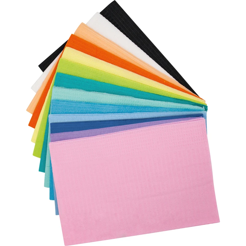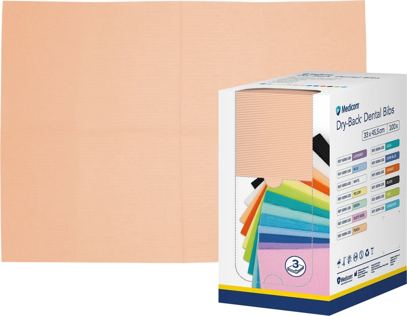 Medicom® Dry-Back® Dental Bibs Farbige Servietten mit hervorragender Absorption durch zusätzliche Papierschicht und rückseitige Folie. Bieten wirkungsvollen Patientenschutz und -komfort. Geeignet für kleinere Eingriffe, bei denen ein zusätzlicher Schutz gewünscht wird. Wählen Sie aus einer Vielzahl von leuchtenden Farben, ideal für die Zusammenstellung eigener Farbsets mit Masken, Bechern und Speichelsaugern. Horizontal geprägtes Muster und einzigartiger wasserabweisender Randbereich.