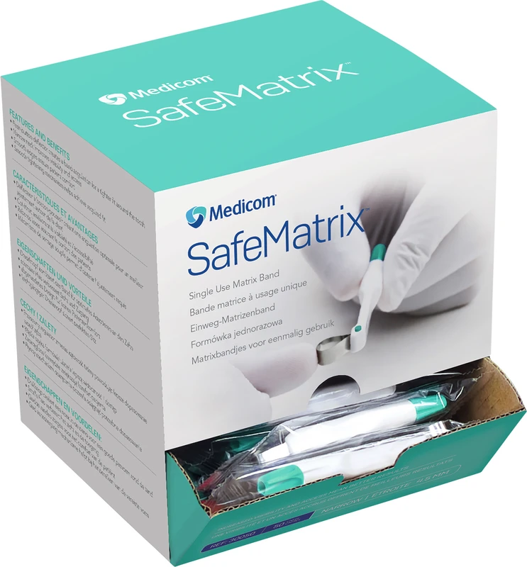 SafeMatrix Einwegmatrizen erleichtern das Formen perfekter Kontaktpunkte bei allen Restaurationen aus Komposit oder Amalgam in jedem Quadranten. Die Matrizen sind denkbar einfach in der Handhabung und erfüllen als Einwegprodukt die Anforderungen an eine effiziente Praxishygiene ohne den sonst erforderlichen Wiederaufbereitungsaufwand.