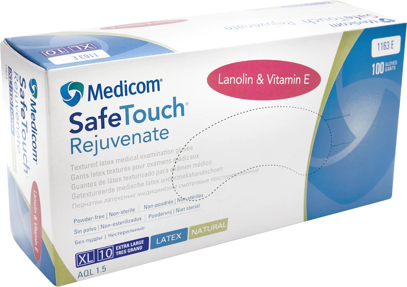 Rejuvenate Latex-Handschuhe haben eine hohe taktile Sensibilität und schützen zuverlässig. Der Lanolin- und Vitamin-E-Zusatz wirkt beruhigend und pflegend auf der Haut und hilft Hautreizungen zu vermeiden. Geeignet für alle Anwender, die keine Probleme mit Latexallergien haben. Medicom® SafeTouch® Rejuvenate medizinische Latex Handschuhe - puderfrei, mit Lanolin- und Vitamin-E-Zusatz, MD Class I, Farbe: natural (beige).