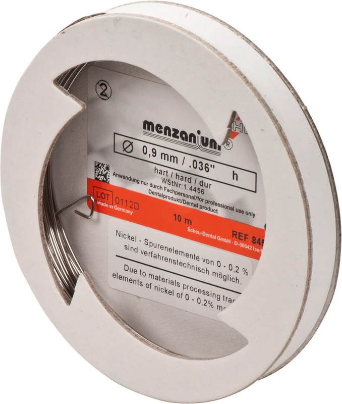 MENZANIUM® ist eine nickelfreie* Edelstahllegierung, bei der in einem patentierten Hochdruck-Schmelzverfahren Mangan und Stickstoff die allergenen Nickelanteile ersetzen. Gleichzeitig erhöht sich die Korrosionsbeständigkeit und Bruchfestigkeit im Vergleich zu herkömmlichen Edelstahldrähten. Unsere Spulendrähte aus MENZANIUM® sind diamantgezogen und hellglänzend. Die Verarbeitung ist durch Fügetechniken wie Lasern und Schweißen möglich.