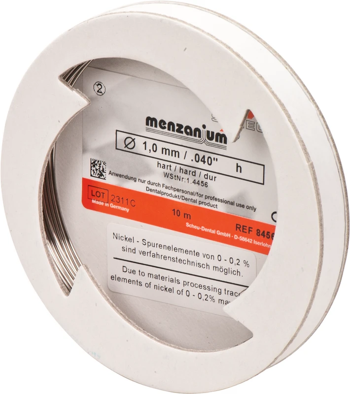 MENZANIUM® ist eine nickelfreie* Edelstahllegierung, bei der in einem patentierten Hochdruck-Schmelzverfahren Mangan und Stickstoff die allergenen Nickelanteile ersetzen. Gleichzeitig erhöht sich die Korrosionsbeständigkeit und Bruchfestigkeit im Vergleich zu herkömmlichen Edelstahldrähten. Unsere Spulendrähte aus MENZANIUM® sind diamantgezogen und hellglänzend. Die Verarbeitung ist durch Fügetechniken wie Lasern und Schweißen möglich.