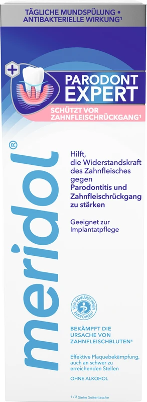 meridol® PARODONT EXPERT Mundspülung bekämpft die Ursache von Zahnfleischbluten und -entzündungen* und hilft die Widerstandskraft des Zahnfleischs gegen die Ursache von Zahnfleischbluten, Parodontitis und Zahnfleischrückgang zu stärken.