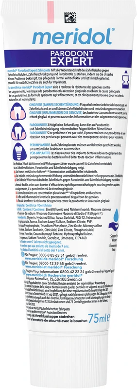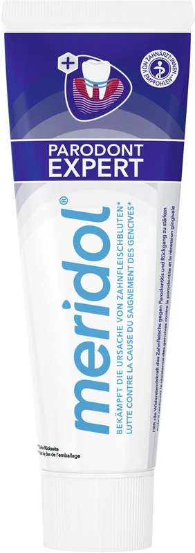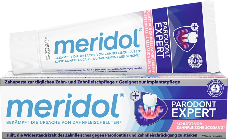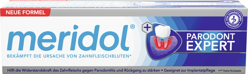 meridol® PARODONT EXPERT Zahnpasta- speziell entwickelt für Patienten mit starken Zahnfleischproblemen bis hin zu Parodontitis. Bietet einen indirekt entzündungshemmenden Effekt, um den natürlichen Heilungsprozess des Zahnfleisches zu unterstützen.