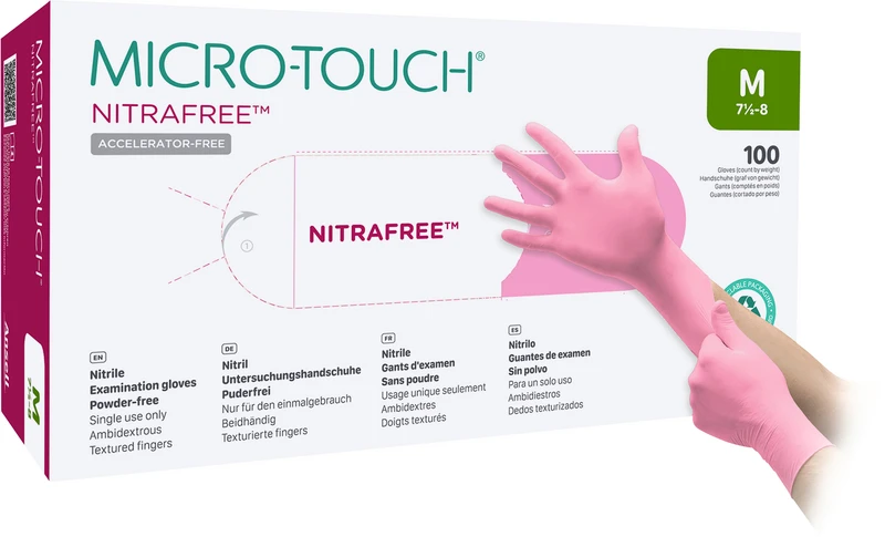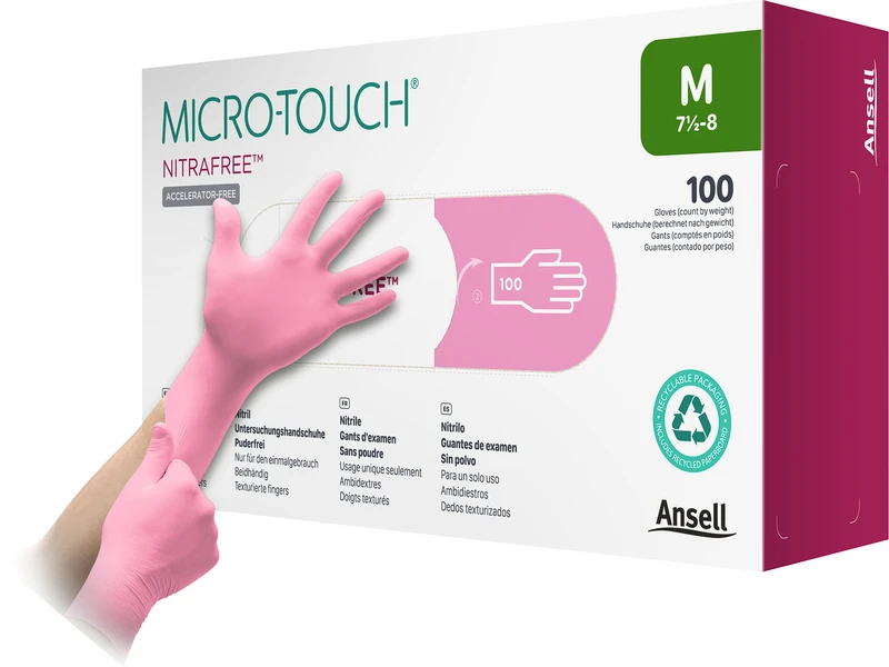 Die MICRO-TOUCH® NITRAFREE Nitril-Untersuchungshandschuhe bestehen aus einer strapazierfähigen und weichen Nitrilformulierung, die ohne chemische Beschleuniger hergestellt wird und den Benutzer vor chemischen Allergien vom Typ IV schützt. Bietet komfortablen und zuverlässigen Schutz und unterstützt gleichzeitig die Brustkrebsforschung.