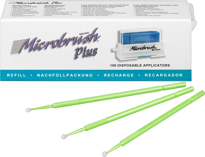 Original Microbrush® Applikatoren, beflockt mit nicht-absorbierenden Fasern. Biegbarer Hals, bleibt in der gewünschten Position und erleichtert das punktgenaue Platzieren von Flüssigkeiten und Gels (Lacke, Liner, Ätzmittel, Adhäsive u.v.m.) in schwer zu erreichenden Bereichen. Auch geeignet für Anfärbemittel. Nachfüllpackung zur Verwendung mit dem Microbrush® Spender.