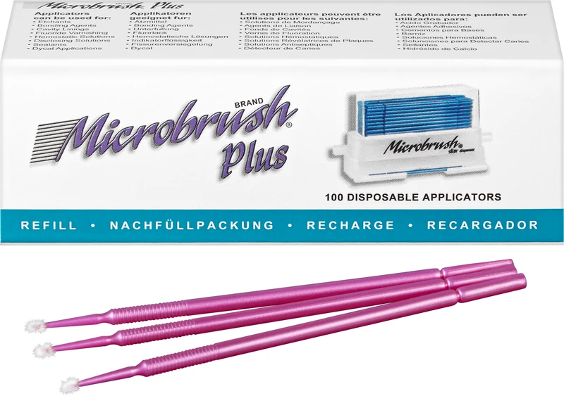 Original Microbrush® Applikatoren, beflockt mit nicht-absorbierenden Fasern. Biegbarer Hals, bleibt in der gewünschten Position und erleichtert das punktgenaue Platzieren von Flüssigkeiten und Gels (Lacke, Liner, Ätzmittel, Adhäsive u.v.m.) in schwer zu erreichenden Bereichen. Auch geeignet für Anfärbemittel. Nachfüllpackung zur Verwendung mit dem Microbrush® Spender.