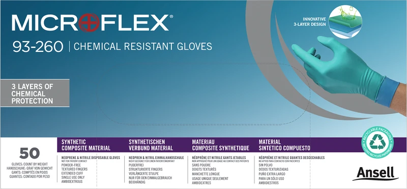 Der Microflex® 93-260 bietet mit seiner von Ansell entwickelten 3-Lagen- Konstruktion einen herausragenden Schutz vor aggressiven Chemikalien, einschließlich Säuren, Lösungsmitteln und Laugen. Als der dünnste am Markt erhältliche Chemikalienschutzhandschuh ermöglicht er eine herausragende Fingerbeweglichkeit und Tastsensibilität. Das extra weiche Material und die anatomische Passform bewirken eine exzellente Passform, ein herausragendes Tragegefühl und eine hohe Flexibilität über längere Tragezeiten. Niedriger AQL-Wert für Mikrolöcher (0,65) und verlängerte Stulpe für einen zuverlässigen Schutz vor Gefahrstoffen. Dieser robuste Chemikalienschutzhandschuh mit einem unschlagbaren Tragekomfort ist die optimale Lösung für das Mischen von Stoffen, Reinigen von Leckagen und Durchführung von Laborarbeiten.